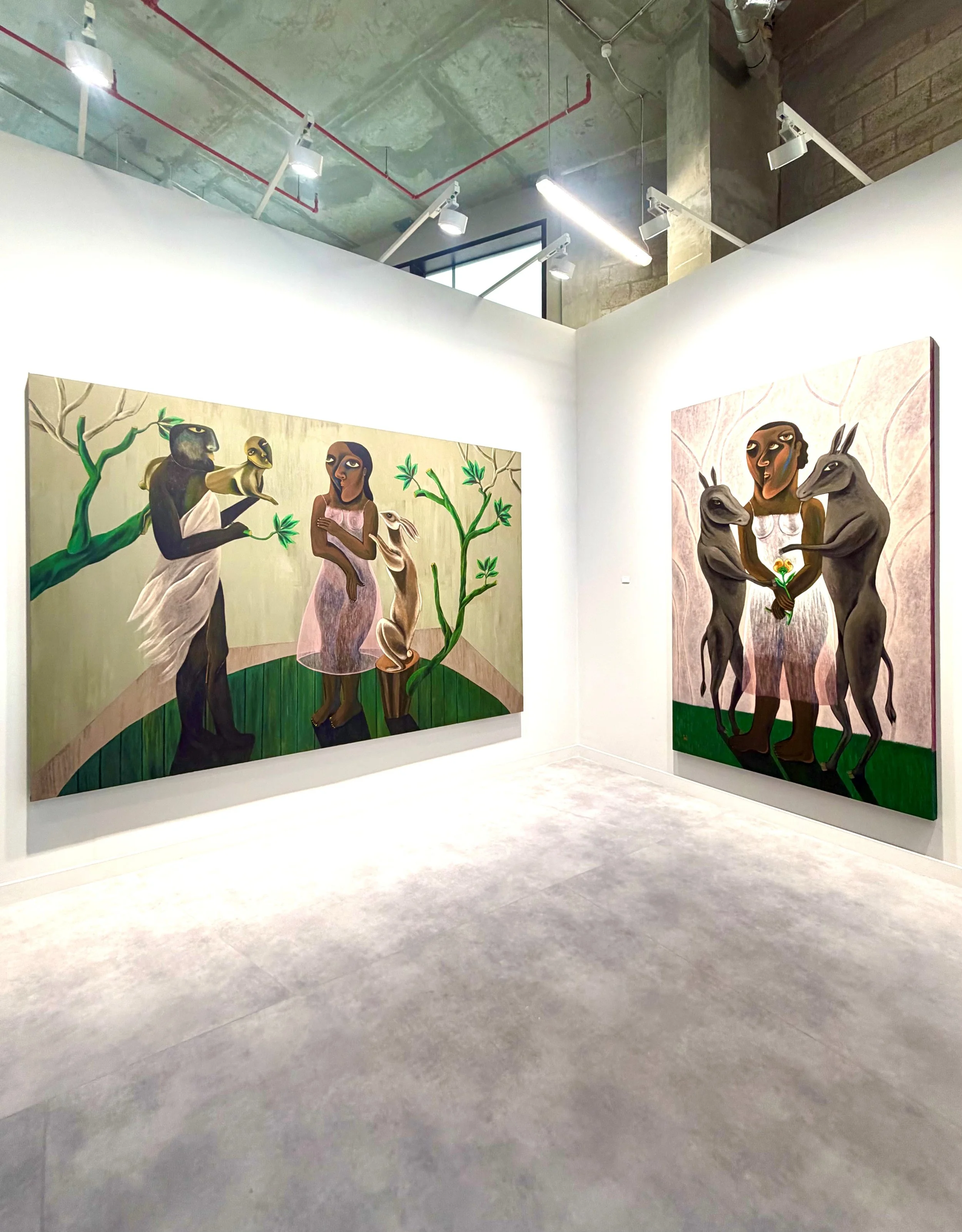 And then there was Egyptian artist Souad Abdelrassoul at Misr Gallery, showing her bold, surreal figuration canvases that put women at the center of a living cosmology. Her paintings read like fables for the present: motherhood and desire meeting constraint, with myths and folklore repurposed as psychological armor. The surfaces are assertive and graphic, yet the narratives stay open as allegories that question how women adapt and resist within patriarchal structures.