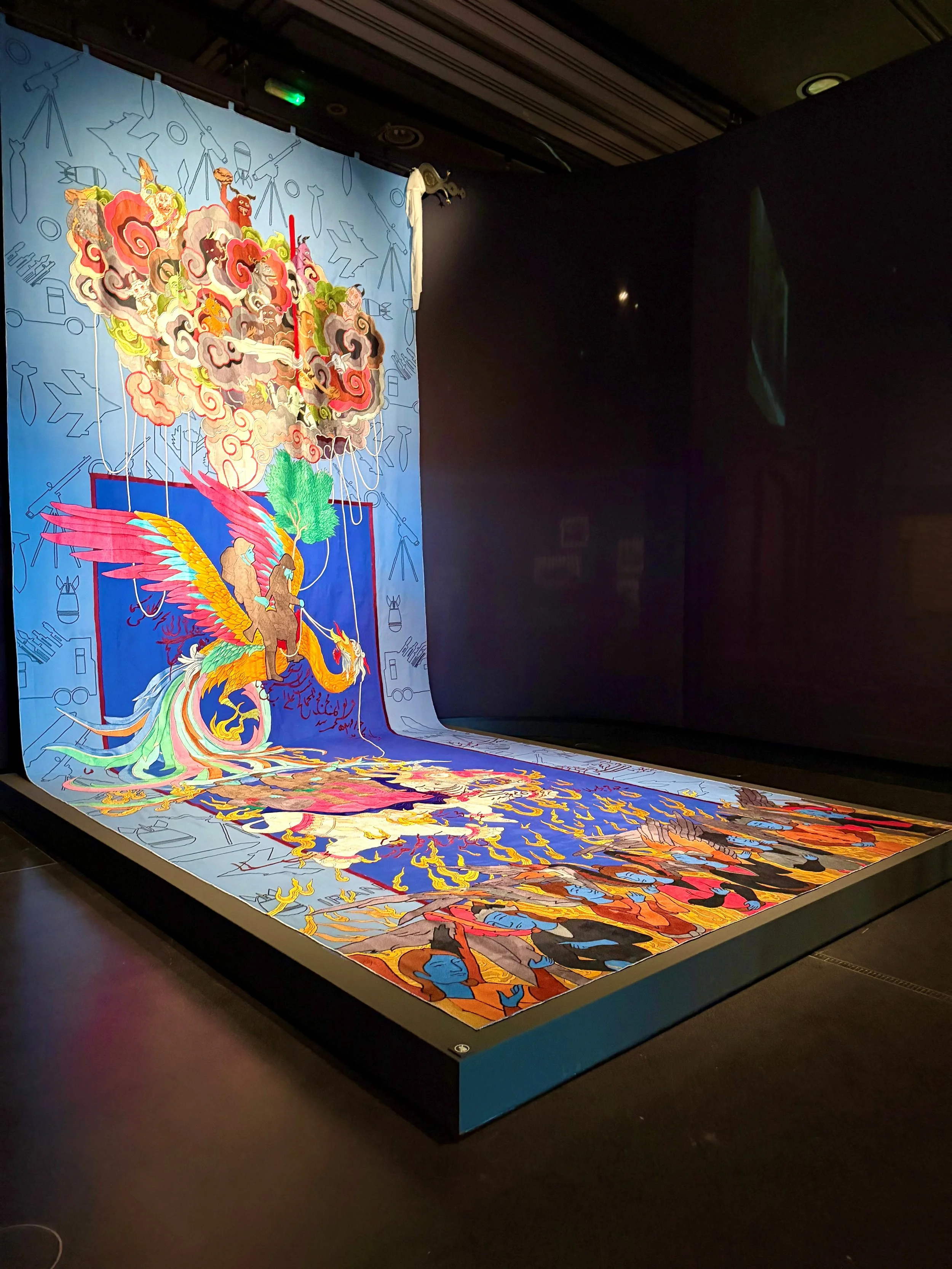 Khadim Ali, Un-Safe Heaven, 2025, synthetic silk, cotton thread on fabric, fabric dye and ink at the Museum of Islamic Art.