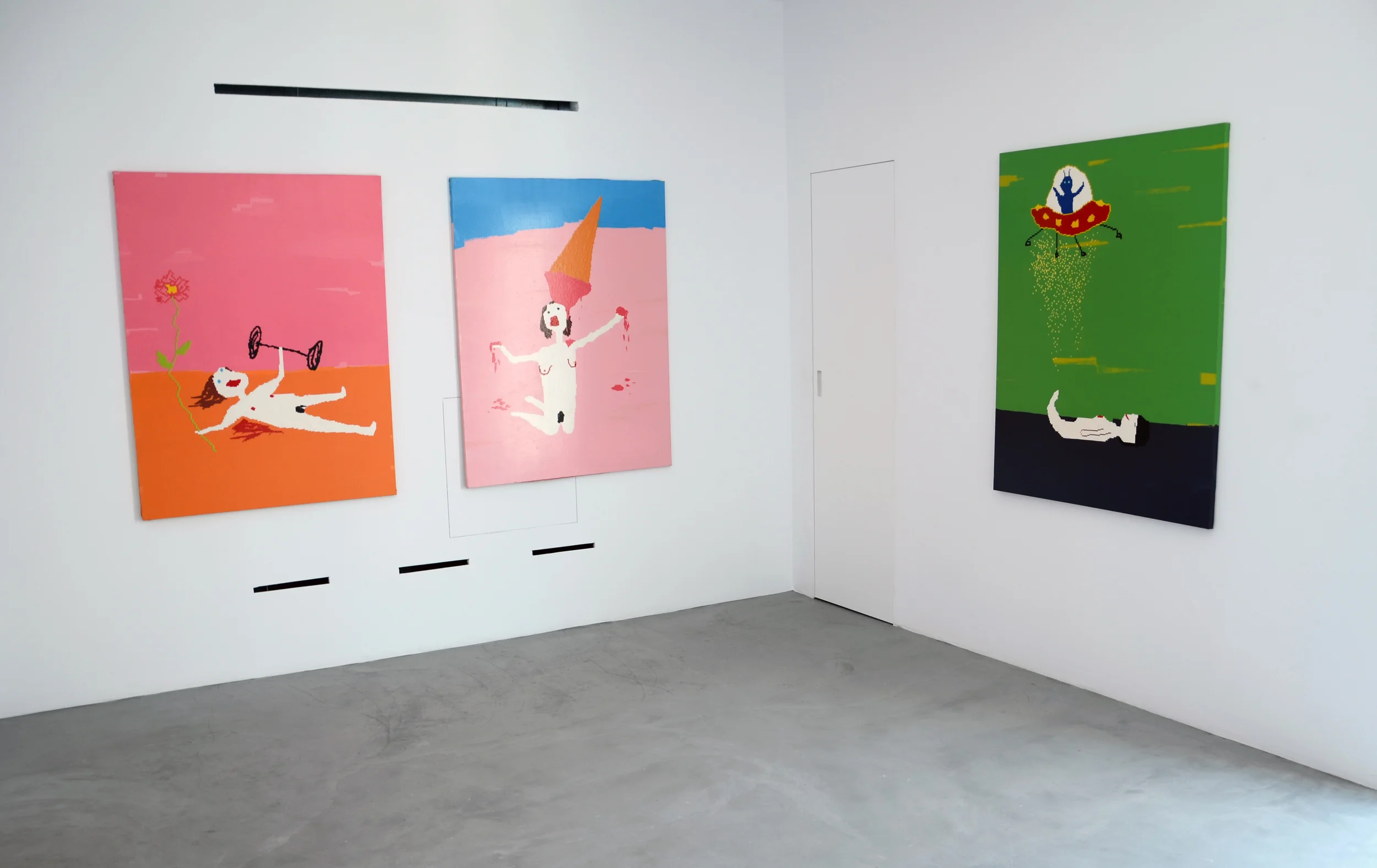 During my visit, there was a group show on the main floor that also spanned the staircase, the courtyard and the rooftop. From this selection, my favorite discovery was the work of Olga Migliaressi-Phoca, whose neon installations are not only witty but also brilliantly executed. On the upper floors are two solo shows that came out of the first Dio Horia artists-in-residence, including Maja Djordjevic, a Serbian artist who, being born in the era of computers and internet, creates pixel-like large canvases with saturated colors. For her “I Don’t Know You, But I Love You” solo show, Djordevic delivered a beautiful group of beach-themed renditions with female characters, mostly purporting herself as a digital doodle playing around in Mykonos. The second solo show belonged to Greek artist Rallou Panagioto, who, using Lycra as her starting point, presented a combination of cast aluminum sculptures of swimsuits, straws and flip flops covered with luxury car spray-paint (I think the sentence would flow better if this part was an adjective in front of "aluminum" but you can decide) along with photographs of bathing suits, alluding at the concept of how memories from holidays become archived and solidified in the mind.