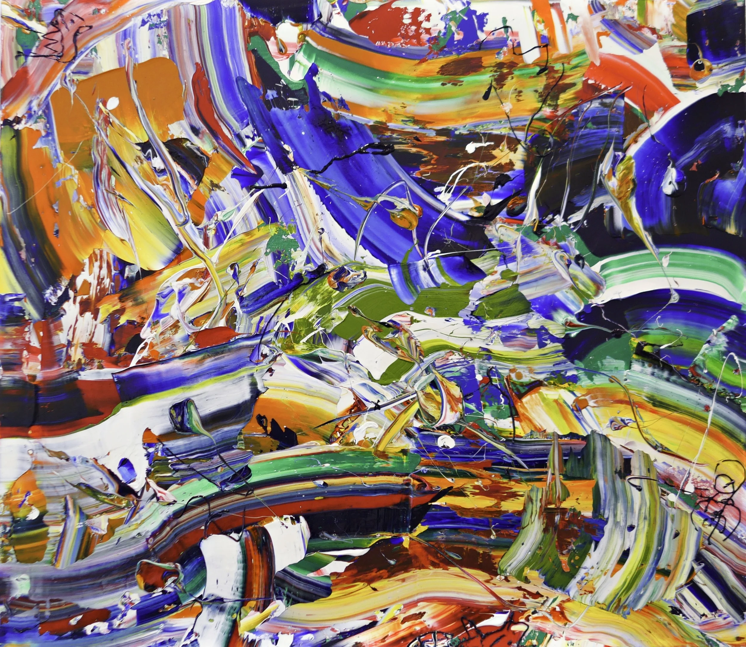 What at a first glance may seem as a beautiful mess isn't so. Each trace, each curve, each color combination has a reason and a purpose - the same way his color palettes and vibrant candy-like textures come together in a canvas following a methodical process. There are references to Jackson Pollock and Gerard Richter, but the addition of an almost-camouflaged smiley or any other humorous symbol is a reminder not to take art history so serious. The pieces seem to suggest that the suffering and dysfunctionality of the artist doesn’t really affect the work in the end.