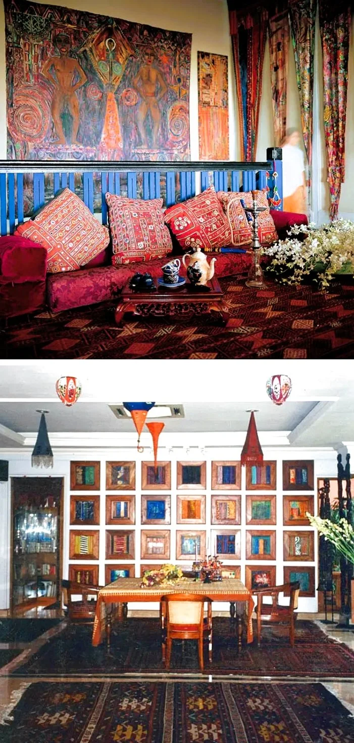 I can only imagine that Pacita Abad was the most interesting guest at any dinner party. Because of her extensive travels she adorned herself with embroidered shawls, telling tales of Afghanistan's craftsmanship, the rhythmic clinking of beads and bangles from the lively streets of Rajasthan, printed scarves from the bazaars of Turkey, turquoise treasures from Iranian markets, a Shan bag from the heart of Burma and silver jewelry echoing the tales of Hill tribes in Thailand and Laos. She also turned her homes and studios into colorful mixes of tribal textiles and sculptures that played side-by-side with her art.