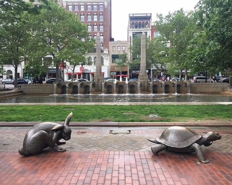 The Tortoise and the Hare, 1994, bronze sculpture by Nancy Schön, installed in Boston's Copley Square.