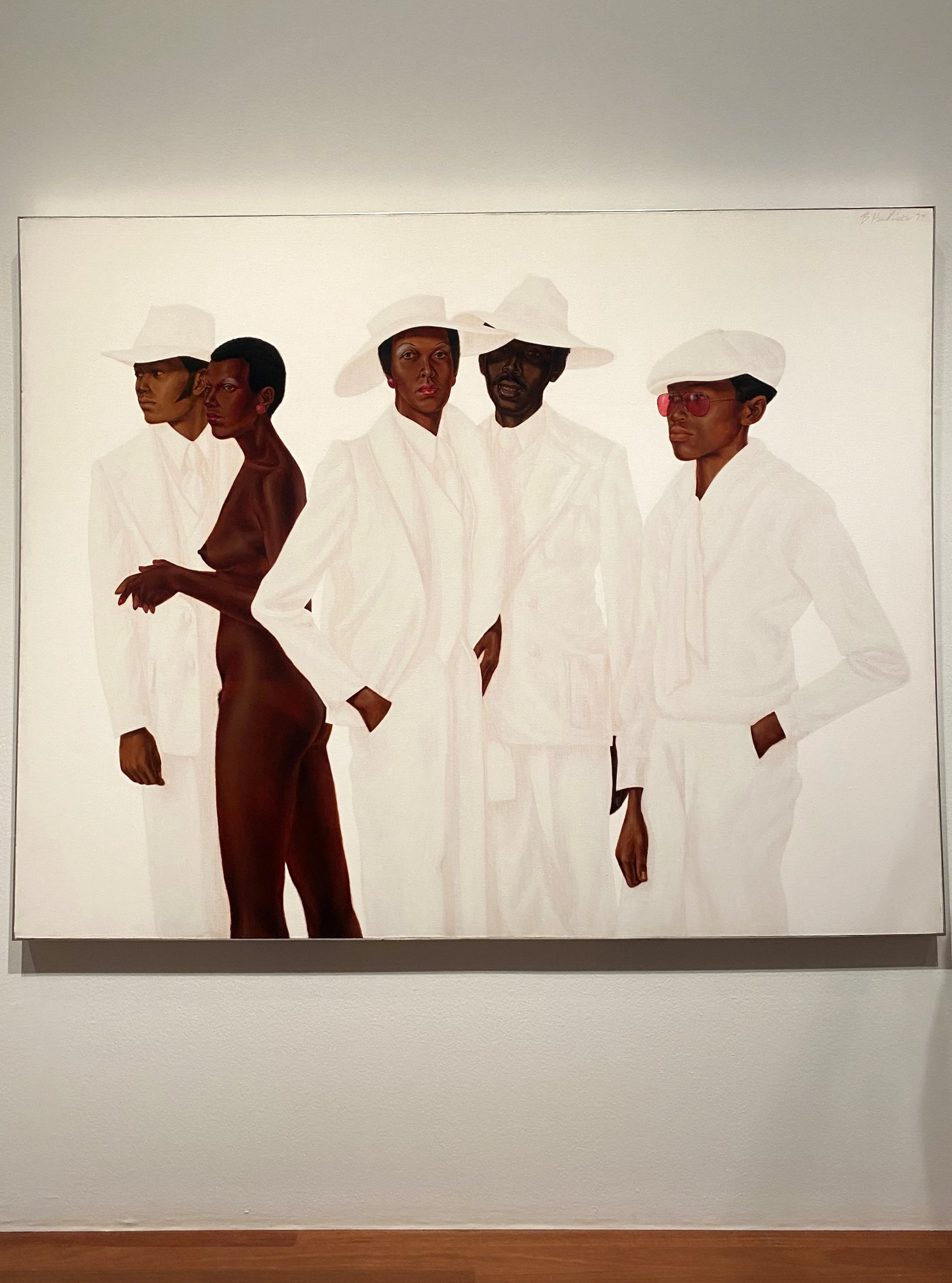 And in 1974, Hendricks painted “What's Going On”, one of his best-known portraits, named after Marvin Gaye's eponymous single. The blank white background on this painting and similar ones derive from popular standards of fashion photography, like Avedon and Irving Penn.