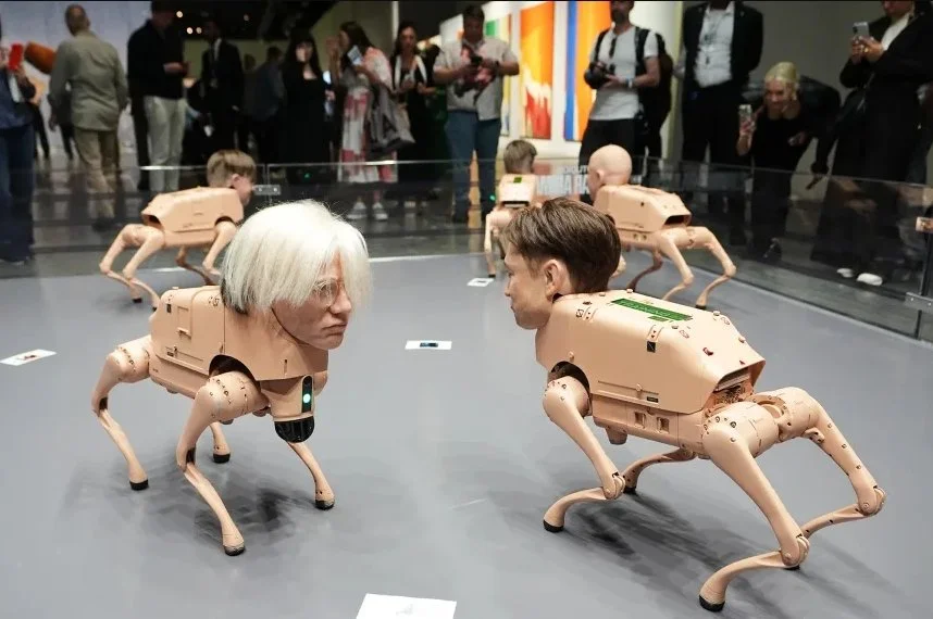 Front and center, Mike Winkelmann (aka Beeple), the artist whose NFT sold for $69.3 million in 2021, staged the week’s most talked-about spectacle: a pen of robot dogs, priced and sold out at $100,000 each, trotting around with the uncanny faces of tech and art celebrities: Elon Musk, Mark Zuckerberg, Jeff Bezos, Pablo Picasso, Andy Warhol and of course, Beeple himself.